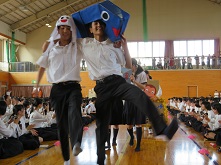真ん中にできた花道を次々と通る、各ブロックのパレードです。1年展示、2年合唱、3年演劇をそれぞれアピールします。