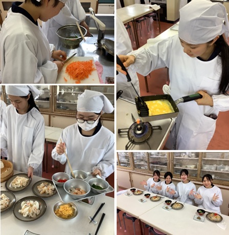 1年生最後の調理実習を行いました。今回のメニューは、春を彩る「ひなまつり献立」で、ちらしずしとはまぐりの吸い物、桜もちを作りました。入学当初はおぼつかなかった包丁さばきや準備の手順も、今では見違えるほどスムーズになりました。限られた時間の中で協力し合い、効率よく仕上げる姿に、この1年の大きな成長を感じました。2年生ではさらに高度な調理に挑戦しパワーアップしていきます。