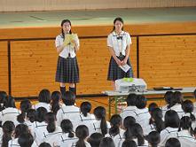 まずは自転車事故の恐ろしさをビデオ観賞で確認。その後は、委員の生徒による実演や解説、クイズなどで、楽しく交通マナーを学ぶことができました。
