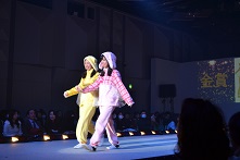 岡山ビジネスカレッジ主催「金の卵発掘ファッションデザインコンテスト」において、服飾デザイン科3年 菅愛友美さんのデザインが、第1位の「金賞」を受賞しました。菅さんの作品は「友達と着たいオシャレパジャマ」のテーマに合わせた「ポカポカアニマルパジャマ」という楽しくかわいいパジャマで、(株)カイタックのグループ企業がプリント生地から仕上げて作品を作ってくださいました。