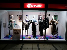 今春卒業した服飾デザイン科3年生が製作したファッションショーの衣裳の一部が、岡山駅前にある「カンコーショップ」のウインドーに展示されています。イオンモール岡山の道を挟んで東側にあるショップの道沿いに飾られています。多くの方が立ち止まって見てくださっているそうです。