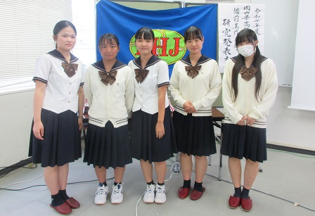 先日開催された家庭クラブ研究発表大会に2組が出場しました。校内ホームプロジェクト発表会で1位だった生活創造科2年大浦ゆいさんは、いつもの食事にプラス1品することで毎日の食事バランスが充実し、栄養効果を上げることができることを発表しました。