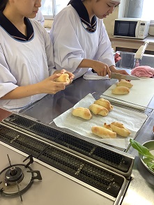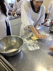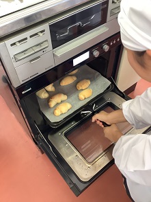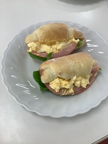 バターロールパン作りに挑戦しました。今回の生地作りは、完全手作業で行いました。最初はべたっとしていた生地も時間をかけてこねていくと一つにまとまっていきました。発酵させて生地を休ませ、成形してオーブンに入れ、ふっくらふわふわに焼き上げました。そのままでも十分おいしいのですが、今回はサンドイッチにしていただきました。