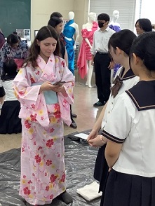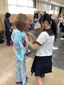 学校訪問に来てくれたオーストラリアの学生に、浴衣の着付け体験をしてもらいました。この日のために、服飾文化の授業で、上手に着付けができるように何度も練習しました。また着付けの仕方を英語で説明できるように調べ学習もしました。