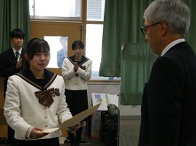 始業式のあと、冬休み中に各種大会で高い成果を収めた生徒たちの表彰伝達、続いて、中国大会にアベック出場を決めたソフトテニス部の男子と女子、そして「皇后盃 第44回全国都道府県対抗女子駅伝」に岡山県代表選手として出場する陸上部の造田彩花さん(生活創造科2年)の健闘を祈る壮行式が行われました!