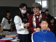 色彩について講義をしていただいた後、クラスを代表して3人が細川先生に「自分の顔の色に合ったカラーコーディネート」をしていただきました。人によって似合う色やアクセサリーが違い、顔立ちがぱっと引き立ったときには、生徒たちから歓声が上がりました。ファッションコーディネートにおける色彩の大切さをしっかり学ぶことができました。