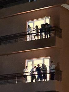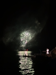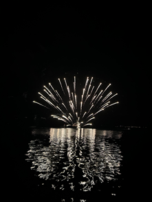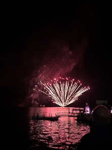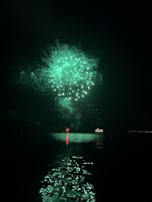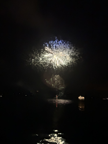 水面にうつる花火を部屋の窓からめでる生徒たちから、歓声が沸き起こっていました。