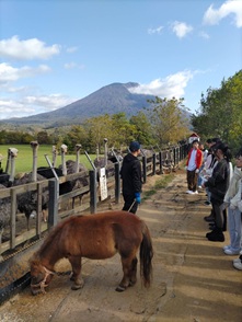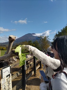 生徒たちよりも大きなダチョウさんにエサをやったり、背くらべしたりと触れ合っている様子。