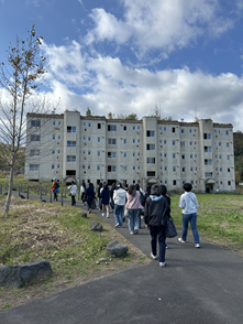 廃屋と化した集合住宅や各建物を見学してまわり、日ごろの備えの大切さを学びます。
